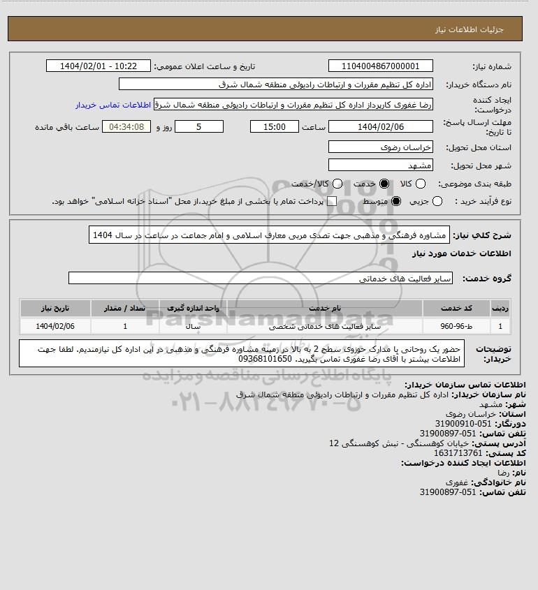 شرح کلی نیاز: مشاوره فرهنگی و مذهبی جهت تصدی مربی معارف اسلامی و امام جماعت در ساعت در سال 1404