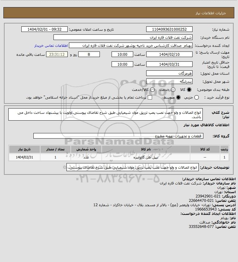 شرح کلی نیاز: انواع اتصالات و ولو جهت نصب پمپ تزریق مواد شیمیایی طبق شرح تقاضای پیوستی.اولویت با پیشنهاد ساخت داخل می باشد.