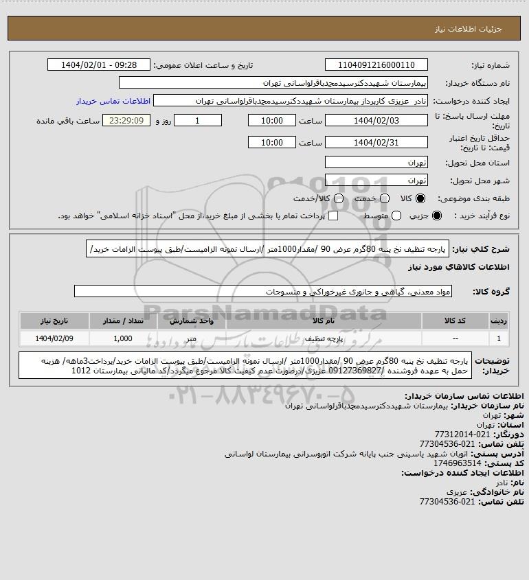 | 1 | -- | پارچه تنظیف | متر | 1,000 | 1404/02/09 |