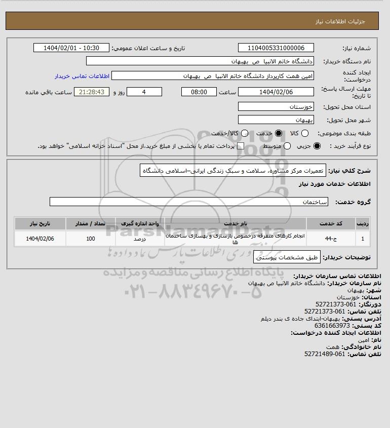 شرح کلی نیاز: تعمیرات مرکز مشاوره، سلامت و سبک زندگی ایرانی–اسلامی دانشگاه