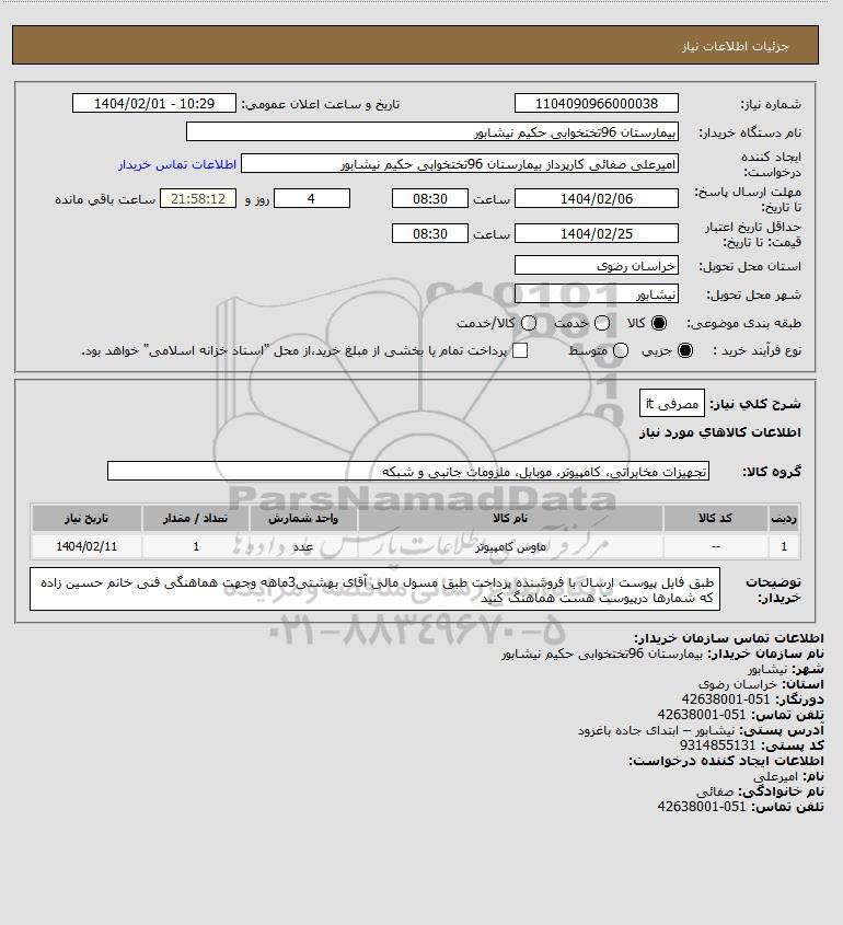 نام دستگاه خریدار:بیمارستان 96تختخوابی حکیم نیشابور