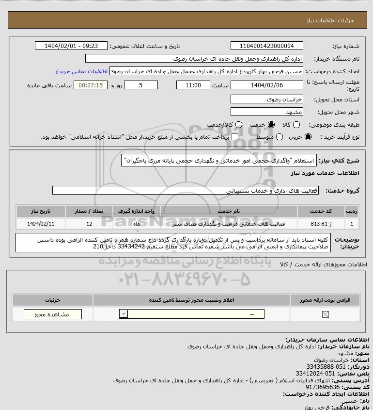 شرح کلی نیاز: استعلام "واگذاری حجمی امور خدماتی و نگهداری حجمی پایانه مرزی باجگیران"
