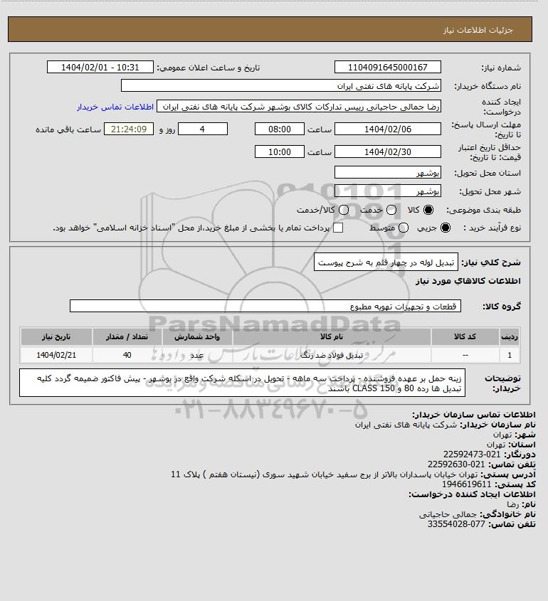 شرح کلی نیاز: تبدیل لوله در چهار قلم به شرح پیوست