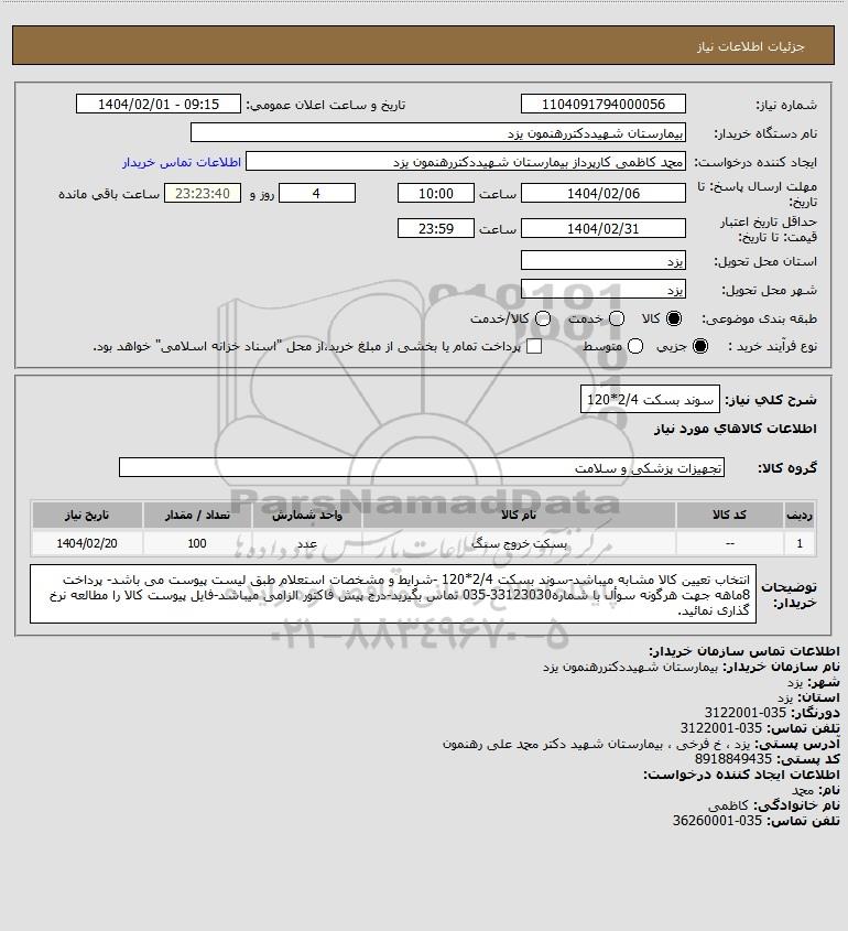 توضیحات خریدار:انتخاب تعیین کالا مشابه میباشد-سوند بسکت 2/4*120 -شرایط و مشخصات استعلام طبق لیست پیوست می باشد- پرداخت 8ماهه جهت هرگونه سوأل با شماره33123030-035 تماس بگیرید-درج پیش فاکتور الزامی میباشد-فایل پیوست کالا را مطالعه نرخ گذاری نمائید.