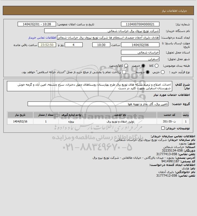 شرح کلی نیاز: احداث، اصلاح و ترمیم شبکه های توزیع برق طرح بهارستان روستاهای چهل دختران، سرخ چشمه، امین آباد و گرمه خوش شهرستان اسفراین بصورت کلید در دست