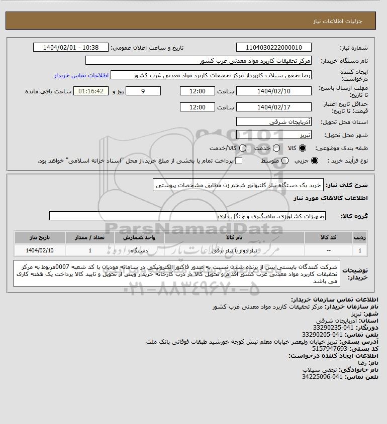 استعلام بها و موضوع استعلام استعلام خرید یک دستگاه تیلر کلتیواتور شخم زن مطابق مشخصات پیوستی به اطلاع کلیه شرکت‌ها و افراد متخصص واجد شرایط می‌رساند، آگهی گذار در نظر دارد از طریق استعلام بها، نسبت به انتخاب و دریافت پیشنهادات اقدام نماید. این استعلام با کد آگهی ثبت شده در سامانه خبرگزاری پارس نماد : 8905588 منتشر شده است. مشخصات استعلام : تاریخ شروع استعلام: 1404/02/01 آخرین مهلت ارسال پیشنهاد قیمت : 1404/02/10 و محل اجرای پروژه : استان آذربایجان شرقی میباشد. استعلام قیمت مورد درخواست : استعلام خرید یک دستگاه تیلر کلتیواتور شخم زن مطابق مشخصات پیوستی با دسته‌بندی‌های تخصصی و گروه های مرتبط : تجهیزات و خدمات کشاورزی و دامپروری, استعلام اطلاع رسانی میگردد.