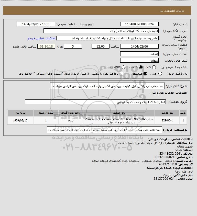شرح کلی نیاز: استعلام چاپ وتکثیر طبق قرارداد پیوستی تکمیل وارسال مدارک پیوستی الزامی میباشد.