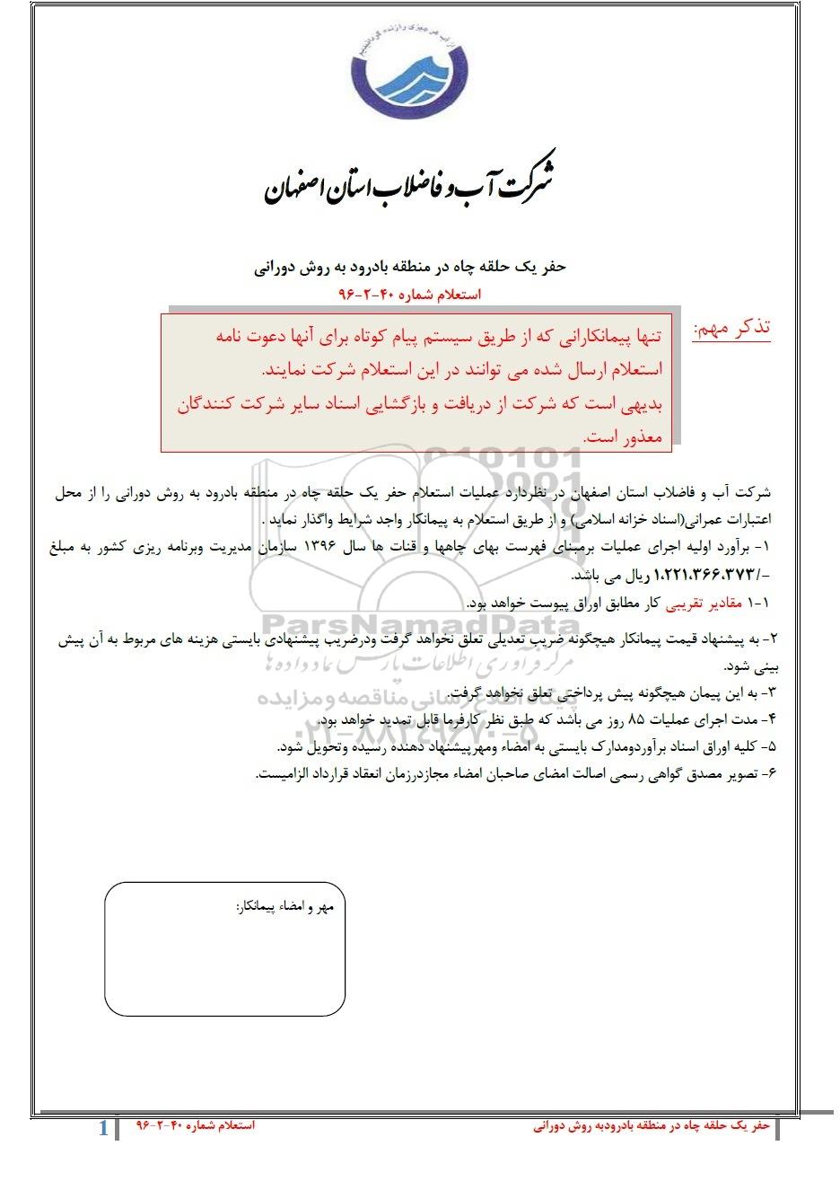 شرکت آب وفاضلاب استان اصفهان در نظر دارد عملیات استعلام حفر یک حلقه چاه در منطقه بادرود به روش دورانی را از محل اعتبارات عمرانی اسناد خزانه اسلامی و از طریق استعلام به پیمانکار واجد شرایط واگذار نماید.