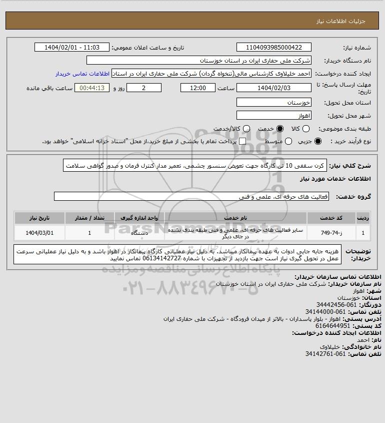 استعلام کرن سقفی 10 تن کارگاه جهت تعویض سنسور چشمی تعمیر مدار کنترل فرمان و صدور گواهی سلامت, استعلام کرن سقفی 10 تن کارگاه جهت تعویض سنسور چشمی، تعمیر مدار کنترل فرمان و صدور گواهی سلامت