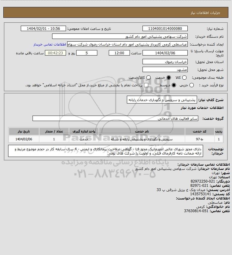 شرح کلی نیاز: پشتیبانی و سرویس و نگهداری خدمات رایانه