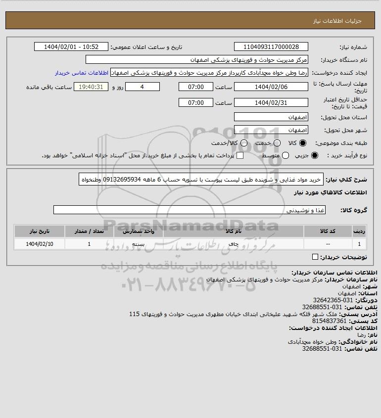 نام دستگاه خریدار:مرکز مدیریت حوادث و فوریتهای پزشکی اصفهان