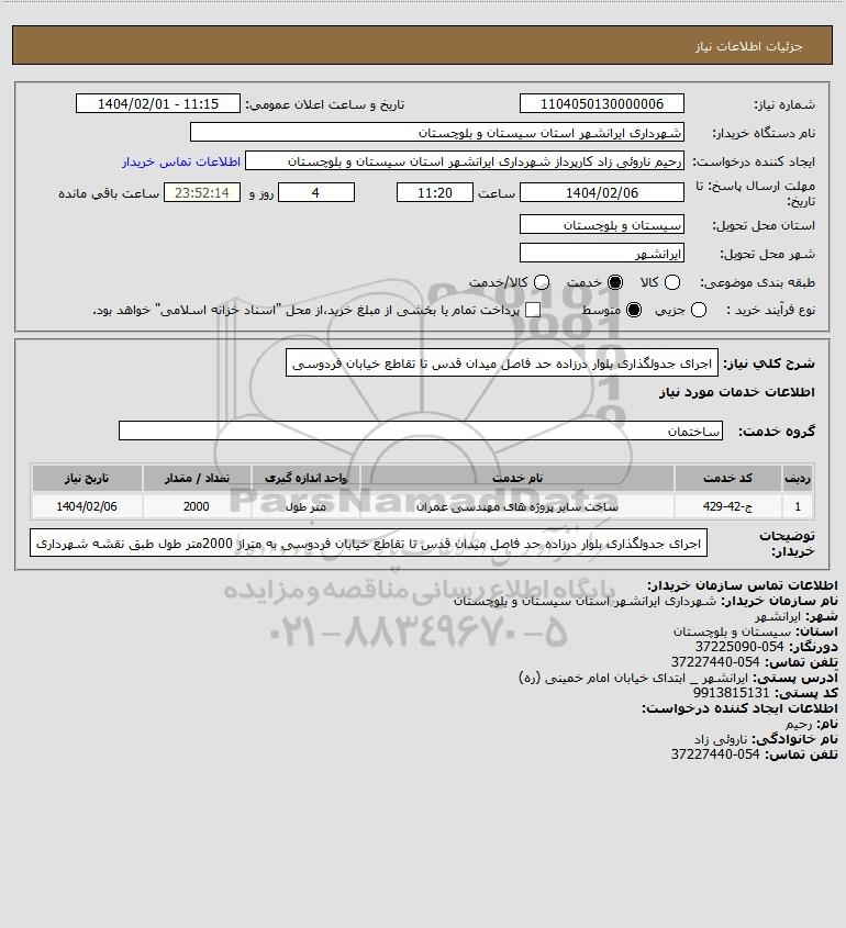 شرح کلی نیاز: اجرای جدولگذاری بلوار درزاده حد فاصل میدان قدس تا تقاطع خیابان فردوسی