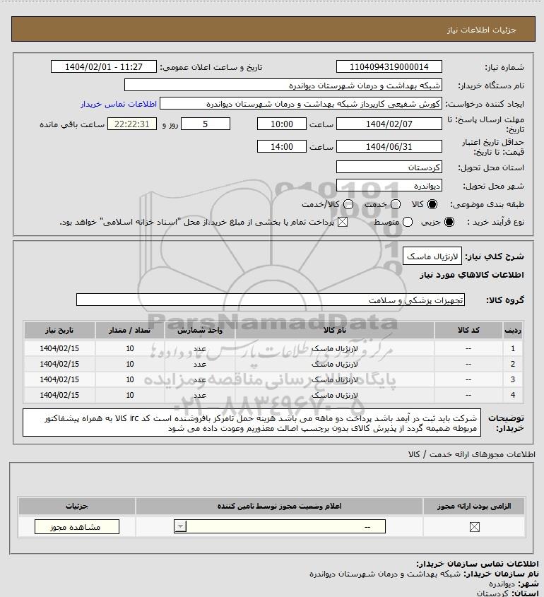 نام دستگاه خریدار:شبکه بهداشت و درمان شهرستان دیواندره