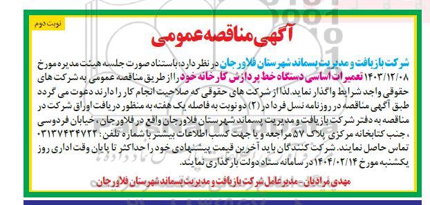 شرکت بازیافت و مدیریت پسماند شهرستان فلاورجان در نظر دارد باستناد صورت جلسه هیئت مدیره مورخ 1403.12.08 تعمیرات اساسی دستگاه خط پردازش کارخانه خود را از طریق مناقصه عمومی به شرکت های حقوقی واجد شرایط واگذار نماید. لذا از شرکتهای حقوقی که صلاحیت انجام کار را دارند دعوت می گردد. طبق آگهی مناقصه در روزنامه نسل فردا در (2) دو نوبت به فاصله یک هفته به منظور دریافت اوراق شرکت در مناقصه به دفتر شرکت بازیافت و مدیریت پسماند شهرستان فلاورجان واقع در فلاورجان خیابان فردوسی جنب کتابخانه مرکزی پلاک 57 مراجعه و یا جهت کسب اطلاعات بیشتر با شماره تلفن: 03137434722 تماس حاصل نمایند. شرکت کنندگان باید آخرین قیمت پیشنهادی خود را حداکثر تا پایان وقت اداری روز یکشنبه مورخ 1404.02.14 در سامانه ستاد دولت بارگذاری نمایند.