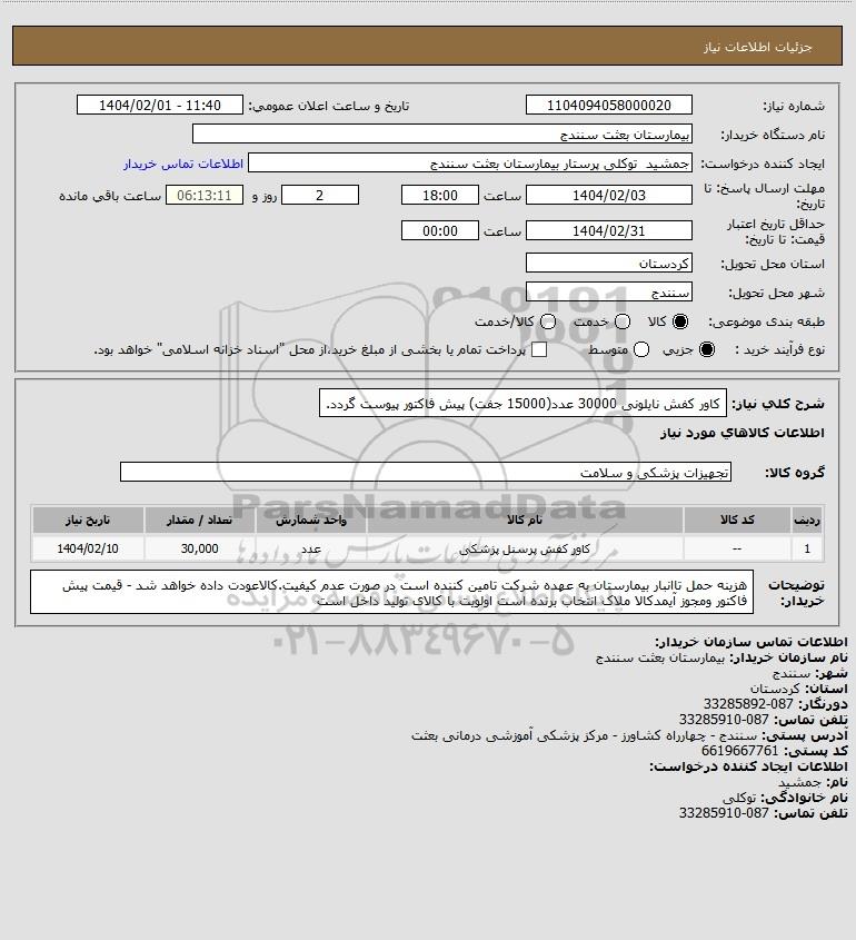 | 1 | -- | کاور کفش پرسنل پزشکی | عدد | 30,000 | 1404/02/10 |