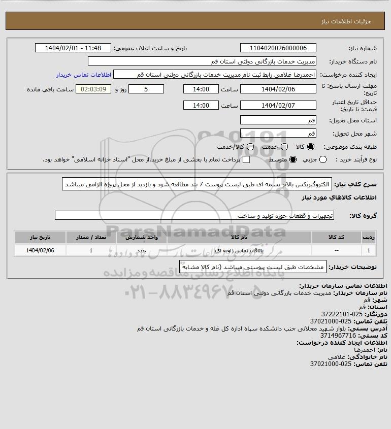 استعلام بها و موضوع استعلام استعلام الکتروگیربکس بالابر تسمه ای طبق لیست پیوست 7 بند مطالعه شود و بازدید از محل پروژه الزامی میباشد به اطلاع کلیه شرکتها و افراد متخصص واجد شرایط میرساند، آگهی گذار در نظر دارد از طریق استعلام بها، نسبت به انتخاب و دریافت پیشنهادات اقدام نماید. این استعلام با کد آگهی ثبت شده در سامانه خبرگزاری پارس نماد : 8905945 منتشر شده است. مشخصات استعلام : تاریخ شروع استعلام: 1404/02/01 آخرین مهلت ارسال پیشنهاد قیمت : 1404/02/06 و محل اجرای پروژه : استان قم میباشد. استعلام قیمت مورد درخواست : استعلام الکتروگیربکس بالابر تسمه ای طبق لیست پیوست 7 بند مطالعه شود و بازدید از محل پروژه الزامی میباشد با دستهبندیهای تخصصی و گروه های مرتبط : بالابر صنعتی, انواع بلبرینگ و رولبرینگ, زنجیر صنعتی, تجهیزات و ماشین آلات صنعتی, استعلام اطلاع رسانی میگردد.
