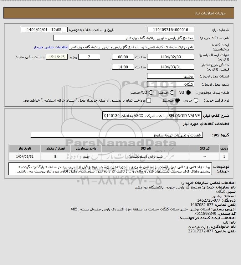 شرح کلی نیاز: SELONOID VALVE ساخت شرکت ASCO/تقاضای 0140130