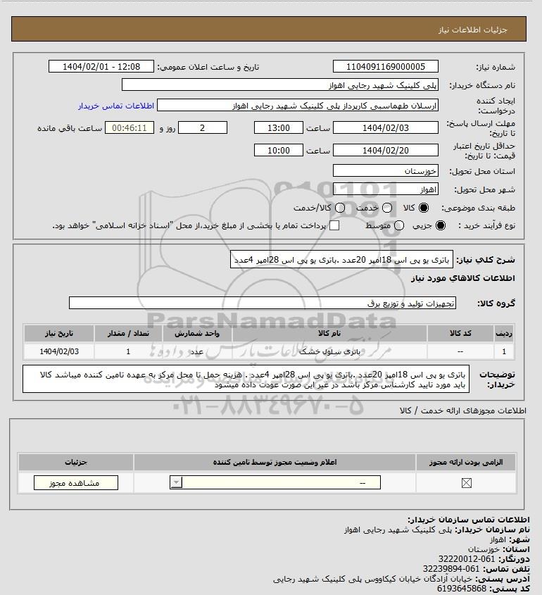توضیحات خریدار:باتری یو پی اس 18امپر 20عدد .باتری یو پی اس 28امپر 4عدد . هزینه حمل تا محل مرکز به عهده تامین کننده میباشد کالا باید مورد تایید کارشناس مرکز باشد در غیر این صورت عودت داده میشود