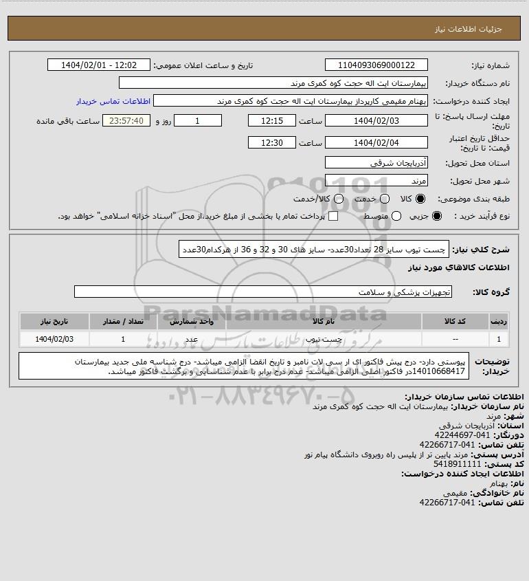 شرح کلی نیاز: چست تیوب سایز 28 تعداد30عدد- سایز های 30 و 32 و 36 از هرکدام30عدد