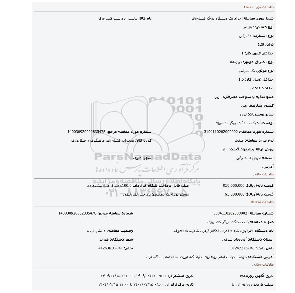 | شرح مورد معامله: حراج یک دستگاه دروگر کشاورزی | نام کالا: ماشین برداشت کشاورزی | |