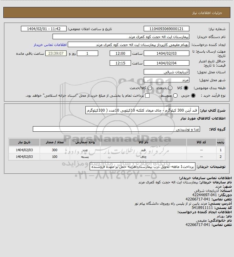 شرح کلی نیاز: قند آیتن 300 کیلوگرم - چای میعاد کلکته 10کیلویی 10عدد ( 100کیلوگرم