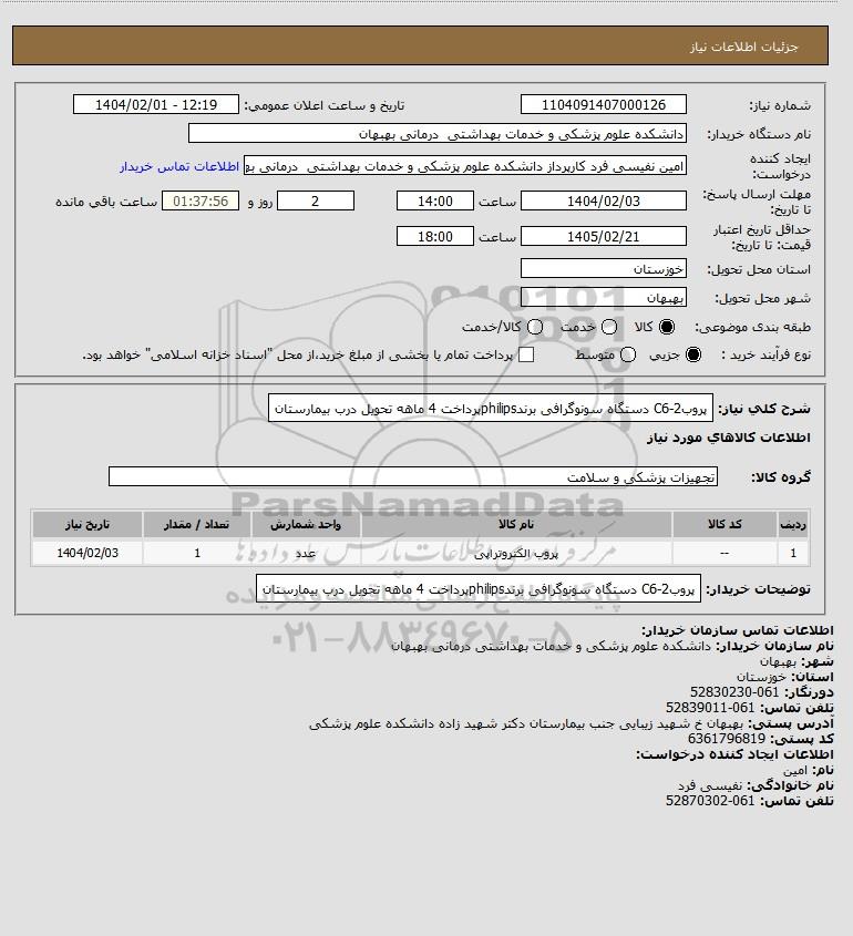 شرح کلی نیاز: پروبC6-2 دستگاه سونوگرافی برندphilipsپرداخت 4 ماهه تحویل درب بیمارستان