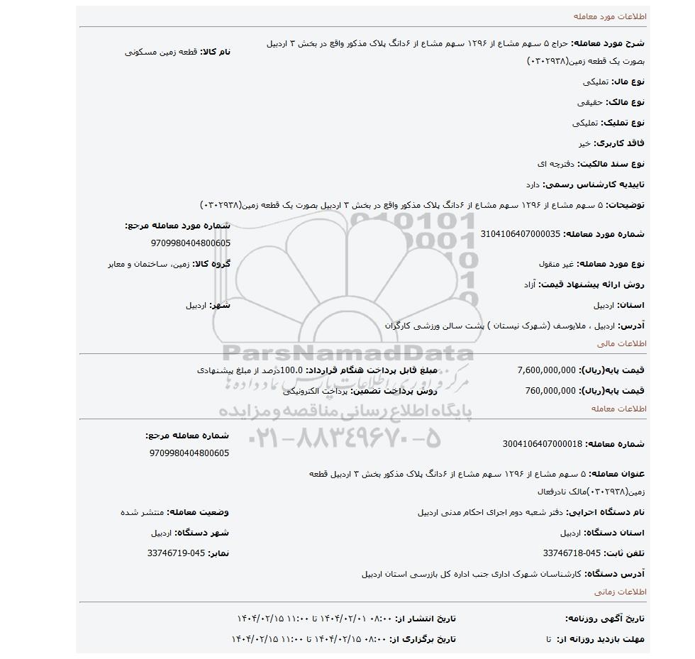 عنوان معامله: ۵ سهم مشاع از ۱۲۹۶ سهم مشاع از ۶دانگ پلاک مذکور بخش ۳ اردبیل قطعه زمین(۰۳۰۲۹۳۸)مالک نادرفعال