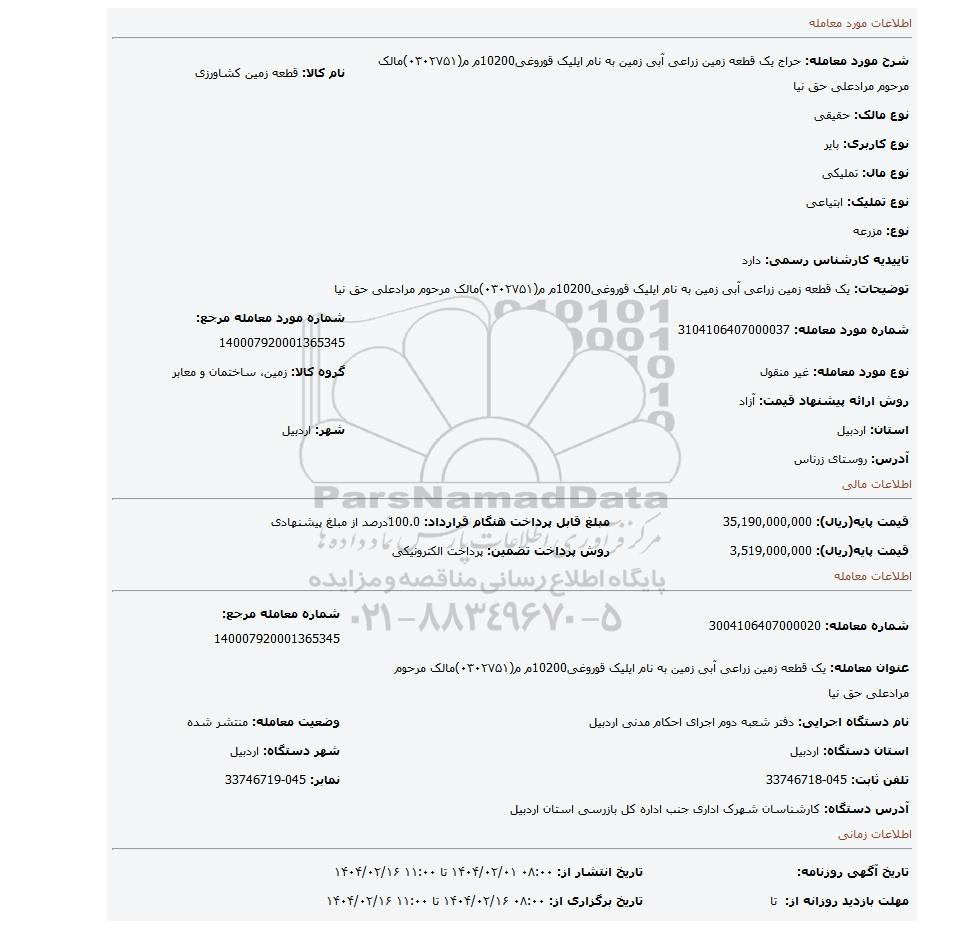 شرح مورد معامله: حراج یک قطعه زمین زراعی آبی زمین به نام ایلیک قوروغی10200م م(۰۳۰۲۷۵۱)مالک مرحوم مرادعلی حق نیا | نام کالا: قطعه زمین کشاورزی | |