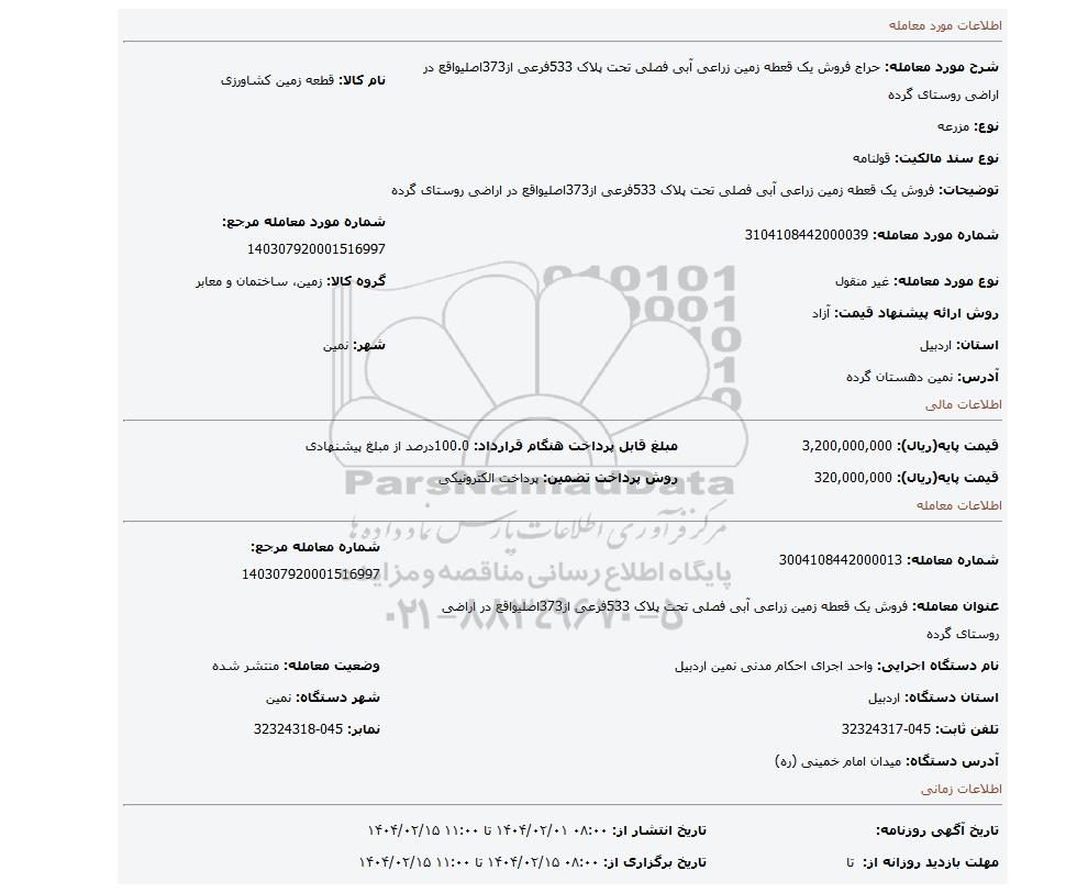 مزایده عمومی مزایده فروش یک قعطه زمین زراعی آبی فصلی تحت پلاک 533فرعی از373اصلیواقع در اراضی روستای گرده برگزار میگردد. از کلیه افراد متخصص و شرکتهای واجد شرایط دعوت به عمل میآید تا در این مزایده با کد خبرگزاری پارس نماد : 8906353 شرکت نمایند تاریخ شروع مزایده : 1404/02/01 مهلت شرکت در مزایده: تا پایان روز 1404/02/15 مکان برگزاری اموال واگذاری استانهای اردبیل و دستهبندیهای مربوط به این حراجی ماشین آلات و تجهیزات کشاورزی و دام پروری, املاک و زمین میباشد.
