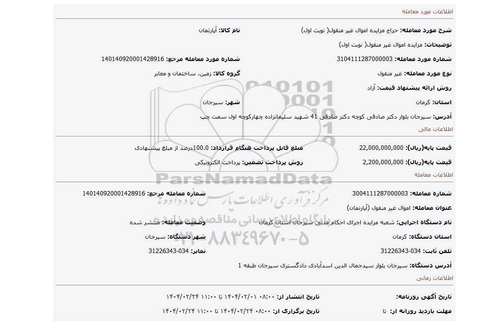 | نام دستگاه اجرایی: شعبه مزایده اجرای احکام مدنی سیرجان استان کرمان | وضعیت معامله: منتشر شده | |