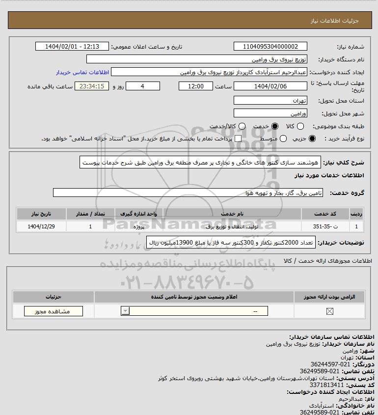 شرح کلی نیاز: هوشمند سازی کنتور های خانگی و تجاری پر مصرف منطقه برق ورامین طبق شرح خدمات پیوست