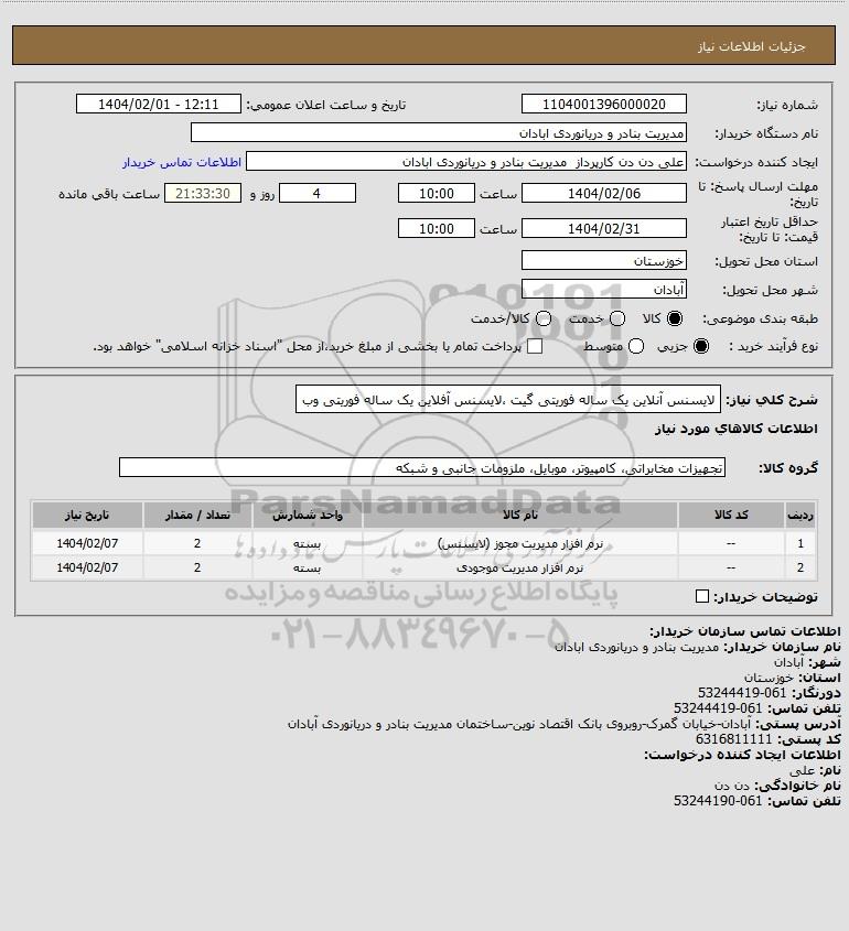 | 1 | -- | نرم افزار مدیریت مجوز (لایسنس) | بسته | 2 | 1404/02/07 |