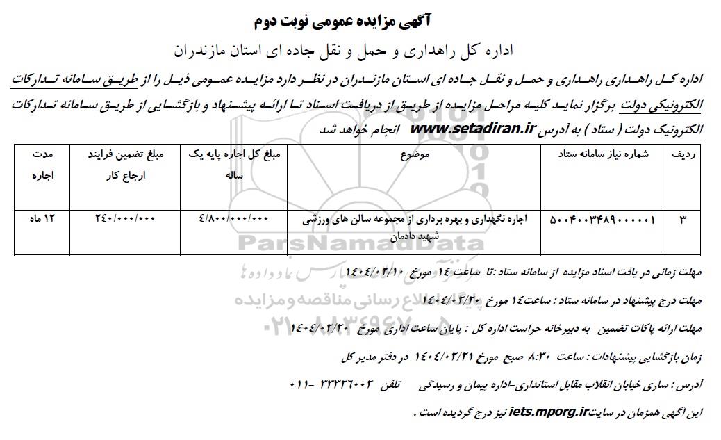 اداره کل راهداری راهداری و حمل و نقل جاده ای استان مازندران در نظر دارد مزایده عمومی ذیل را از طریق سامانه تدارکات الکترونیکی دولت برگزار نماید کلیه مراحل مزایده از طریق از دریافت اسناد تا ارائه پیشنهاد و بازگشایی از طریق سامانه تدارکات الکترونیک دولت ) ستاد ) به آدرس سایت ستاد ایران انجام خواهد شد