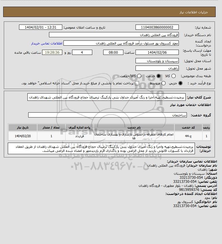 شرح کلی نیاز: برچیدن،تسطیح،تهیه،اجرا و رنگ آمیزی جداول بتنی پارکینگ ترمینال حجاج فرودگاه بین المللی شهدای زاهدان