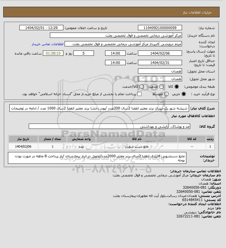 | 1 | -- | مایع دست شویی | عدد | 1 | 1404/02/06 |