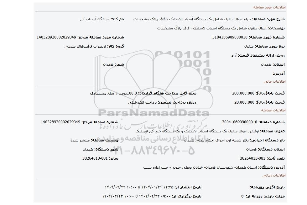 | توضیحات: اموال منقول شامل یک دستگاه آسیاب لاستیک ، فاقد پلاک مشخصات | ||