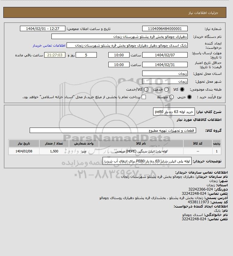 شرح کلی نیاز: خرید لوله 63 ده بار pe80