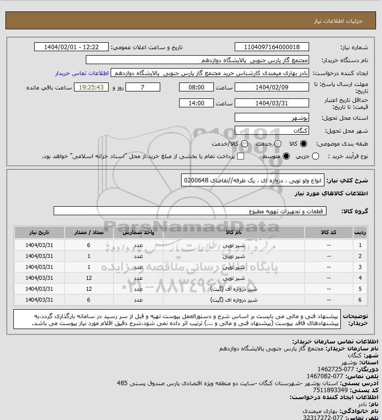 | 5 | -- | شیر دروازه ای (گیت) | عدد | 12 | 1404/03/31 |