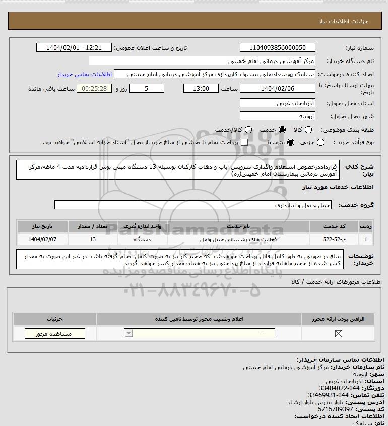 شرح کلی نیاز: قرارداددرخصوص استعلام واگذاری سرویس ایاب و ذهاب کارکنان بوسیله 13 دستگاه مینی بوس قراردادبه مدت 4 ماهه،مرکز آموزش درمانی بیمارستان امام خمینی(ره)