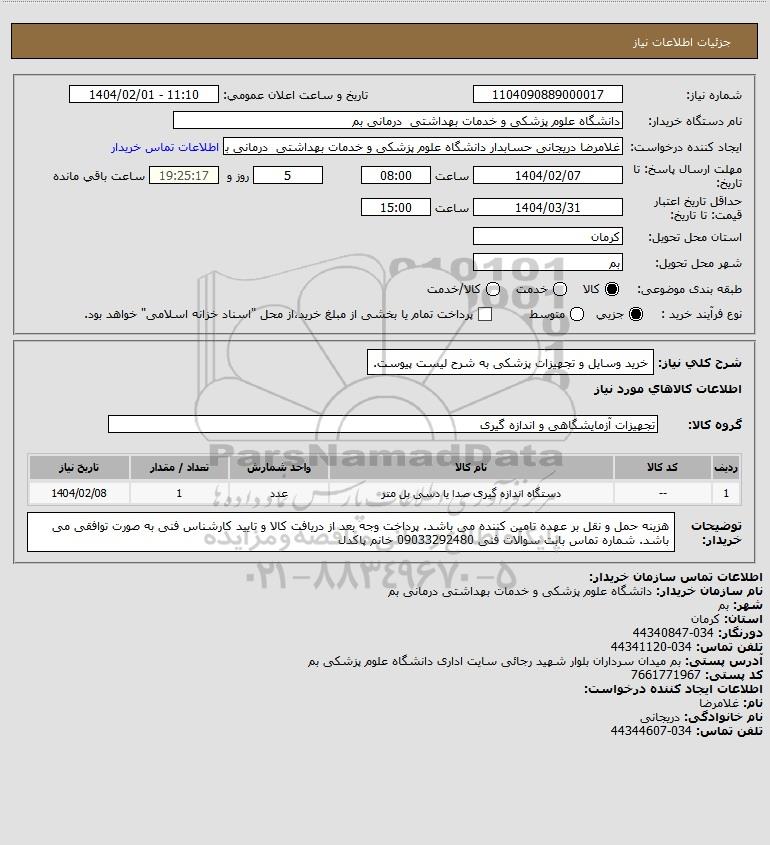 نام دستگاه خریدار:دانشگاه علوم پزشکی و خدمات بهداشتی درمانی بم