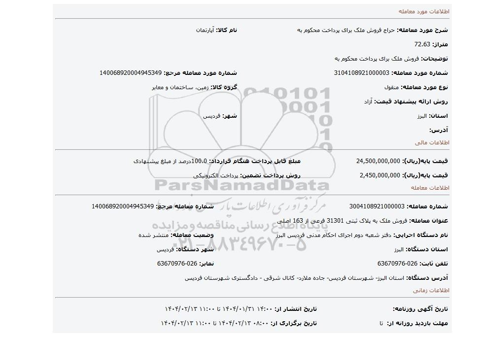 | نام دستگاه اجرایی: دفتر شعبه دوم اجرای احکام مدنی فردیس البرز | وضعیت معامله: منتشر شده | |