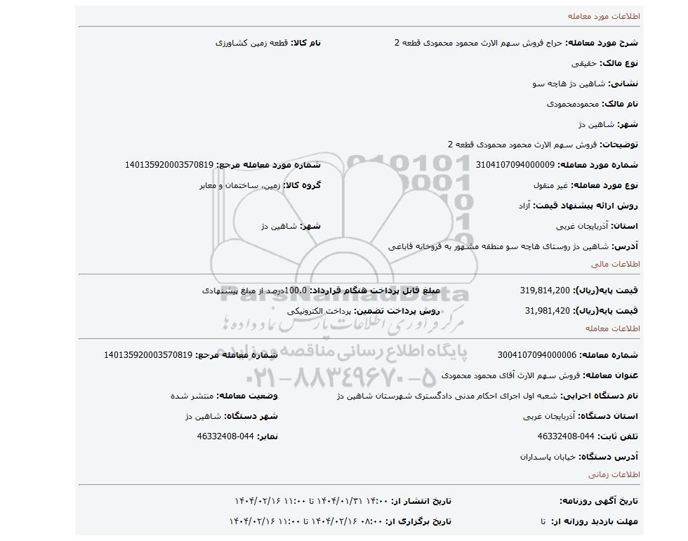 مزایده، فروش سهم الارث محمود محمودی قطعه 2