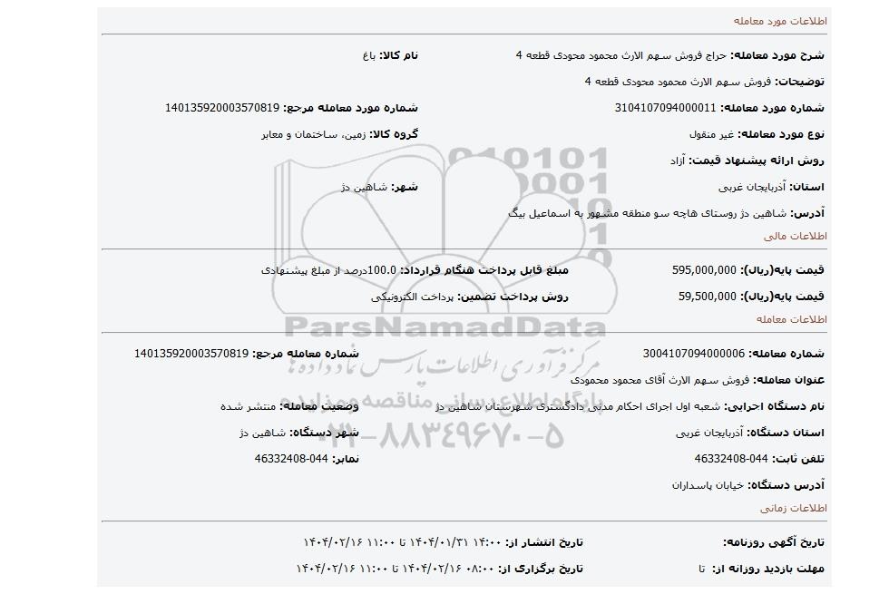 | شرح مورد معامله: حراج فروش سهم الارث محمود محودی قطعه 4 | نام کالا: باغ | |