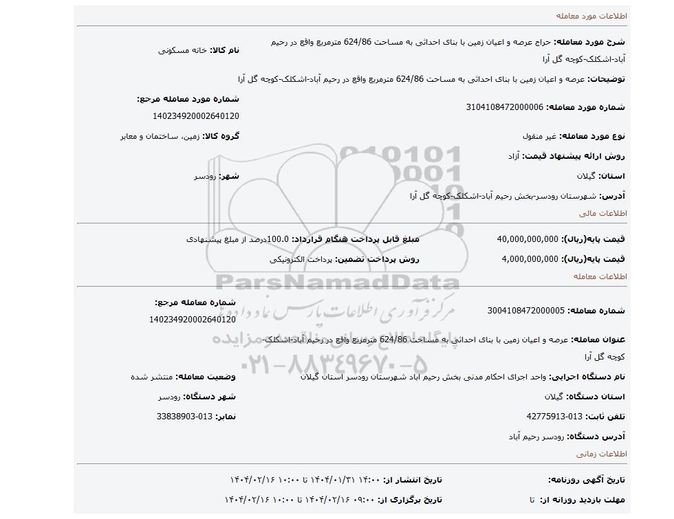 | نوع مورد معامله: غیر منقول | گروه کالا: زمین، ساختمان و معابر | |