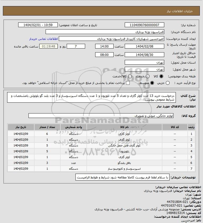 شرح کلی نیاز: درخواست خرید 13 عدد کولر گازی و تعداد 5 عدد تلوزیون و 1 عدد دستگاه اسپرسوساز و 3 عدد بلند گو بلوتوثی بامشخصات و شرایط عمومی پیوست