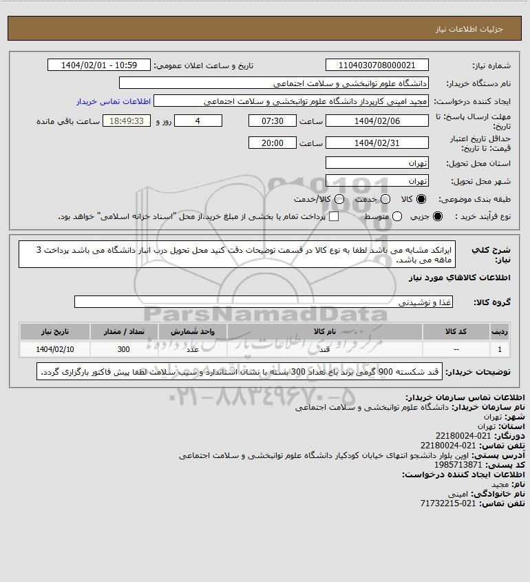 استعلام بها و موضوع استعلام استعلام ایرانکد مشابه می باشد لطفا به نوع کالا در قسمت توضیحات دقت کنید محل تحویل درب انبار دانشگاه می باشد پرداخت 3 ماهه می باشد. به اطلاع کلیه شرکتها و افراد متخصص واجد شرایط میرساند، آگهی گذار در نظر دارد از طریق استعلام بها، نسبت به انتخاب و دریافت پیشنهادات اقدام نماید. این استعلام با کد آگهی ثبت شده در سامانه خبرگزاری پارس نماد : 8906612 منتشر شده است. مشخصات استعلام : تاریخ شروع استعلام: 1404/02/01 آخرین مهلت ارسال پیشنهاد قیمت : 1404/02/06 و محل اجرای پروژه : استان تهران میباشد. استعلام قیمت مورد درخواست : استعلام ایرانکد مشابه می باشد لطفا به نوع کالا در قسمت توضیحات دقت کنید محل تحویل درب انبار دانشگاه می باشد پرداخت 3 ماهه می باشد. با دستهبندیهای تخصصی و گروه های مرتبط : مواد غذایی, استعلام اطلاع رسانی میگردد.