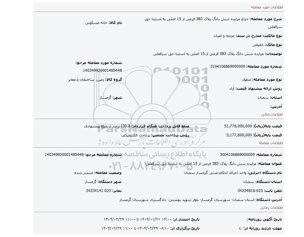 | عنوان معامله: مزایده شش دانگ پلاک 383 فرعی از 15 اصلی به استثنا حق سرقفلی | ||