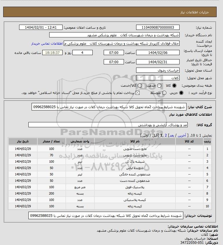 شرح کلی نیاز: شوینده شرایط پرداخت 2ماه تحویل کالا شبکه بهداشت درمان کلات در صورت نیاز تماس با 09962588025