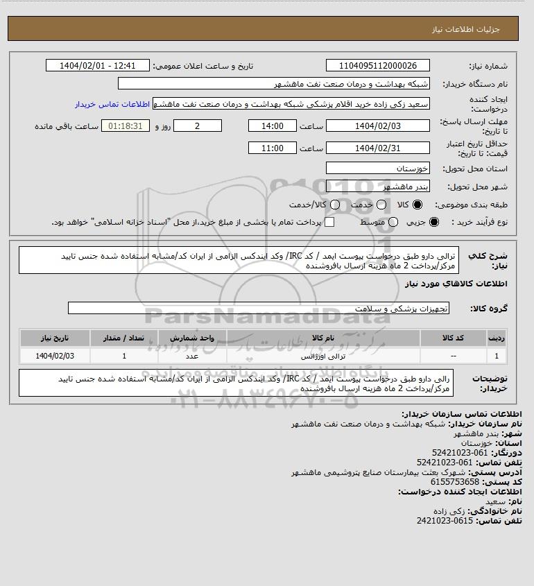 شرح کلی نیاز: ترالی دارو طبق درخواست پیوست ایمد / کد IRC/ وکد ایندکس الزامی از ایران کد/مشابه استفاده شده جنس تایید مرکز/پرداخت 2 ماه هزینه ارسال بافروشنده