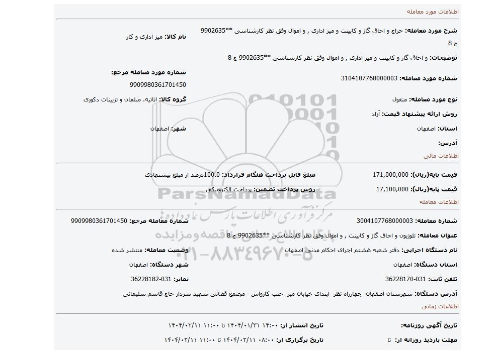 | نام دستگاه اجرایی: دفتر شعبه هشتم اجرای احکام مدنی اصفهان | وضعیت معامله: منتشر شده | |
